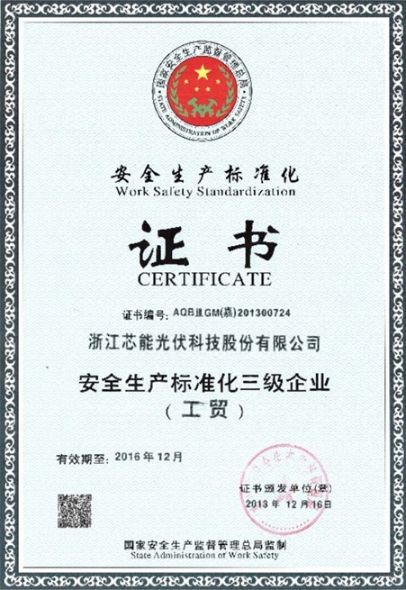 公司通過安全生產(chǎn)標(biāo)準(zhǔn)化三級(jí)驗(yàn)收 2013-12-06 00:00:00 浙江芯能光伏科技股份有限公司 瀏覽次數(shù) 7572 上一條沒有了 下一條“浙江芯能海寧市建材商貿(mào)城1.6MWp光電建筑一體化應(yīng)用示范項(xiàng)目”成功驗(yàn)收