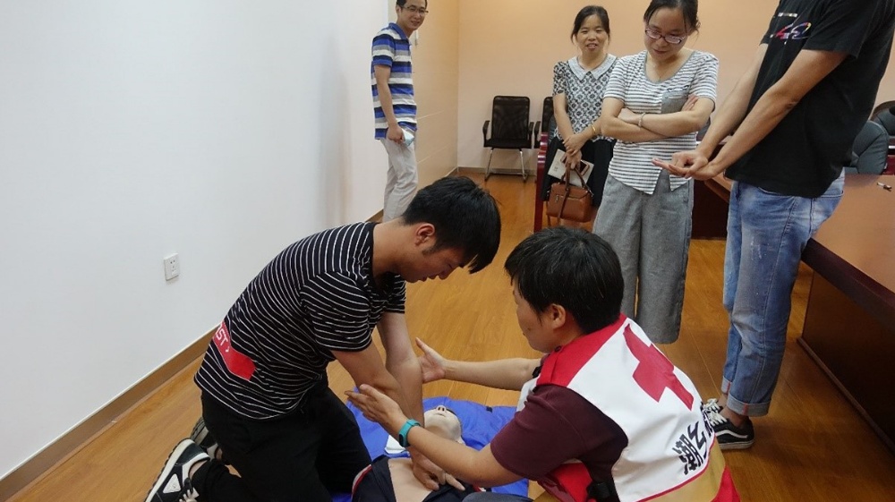 培訓分急救知識和實踐操作兩個部分。沈亮老師利用人體模型、多媒體教案、現場演示、實際案例等多種方式,講授了救護基本概念、心肺復蘇要領以及創傷救護需要注意的事項等現場救護知識,并向學員們演示了心肺復蘇術、人工呼吸法等緊急救護技術,部分受訓人員還進行了現場模擬操練。