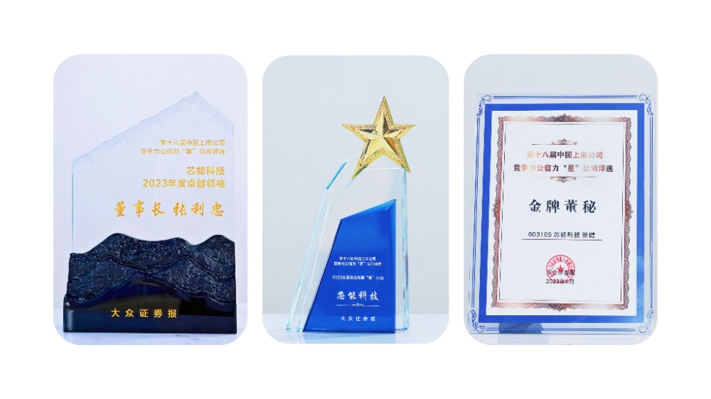 近日,由《大眾證券報》主辦的“第十八屆中國上市公司競爭力公信力‘星’公司評選”獲獎榜單正式發布。芯能科技(603105.SH)榮獲2023年度綠色發展“星”公司;董事長張利忠先生榮獲2023年度卓越領袖;副總經理兼董事會秘書張健先生榮獲2023年度金牌董秘。